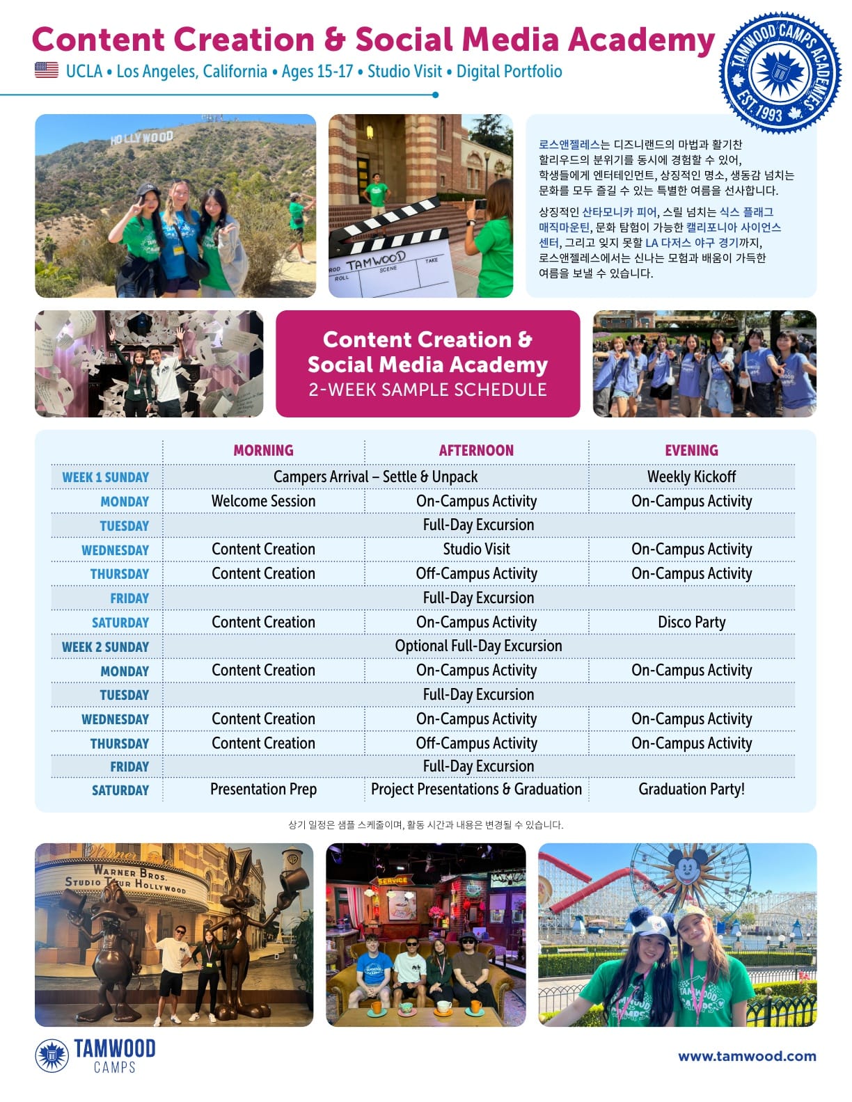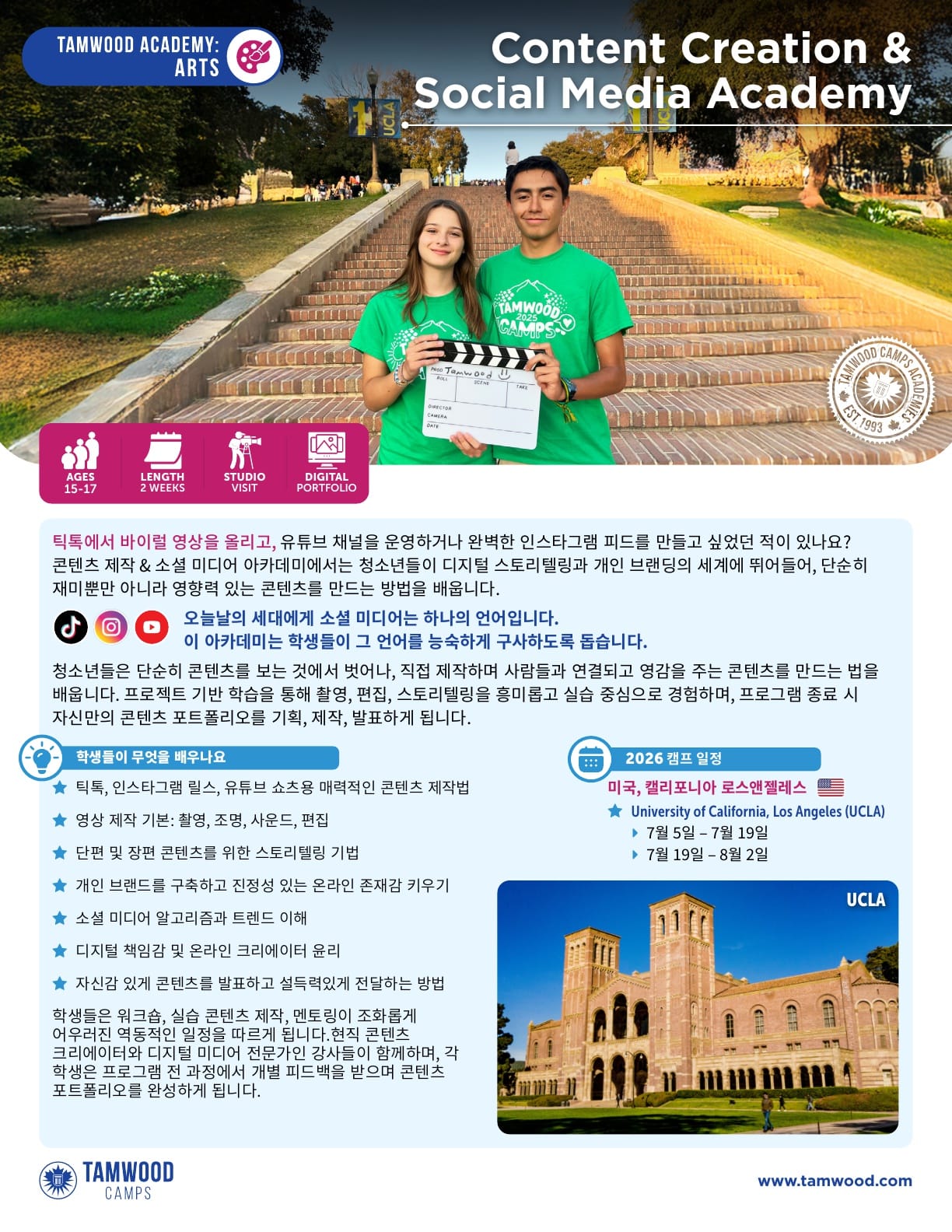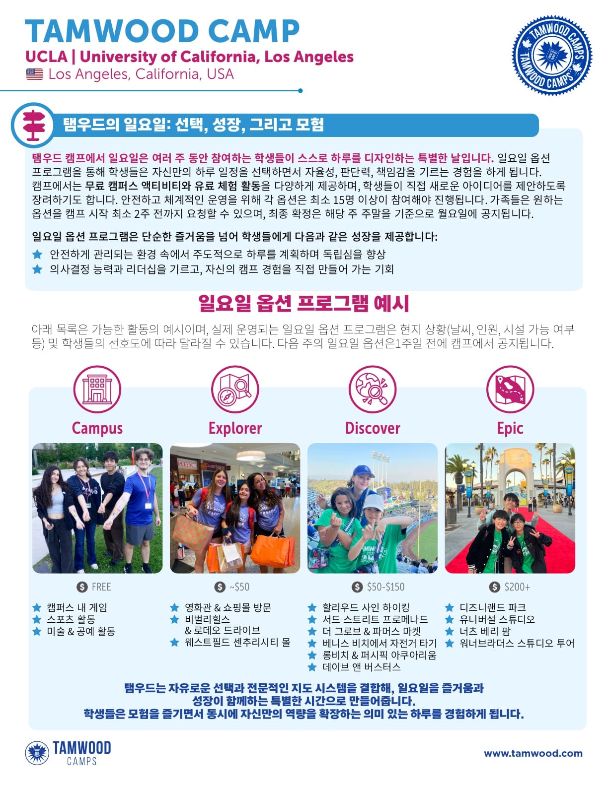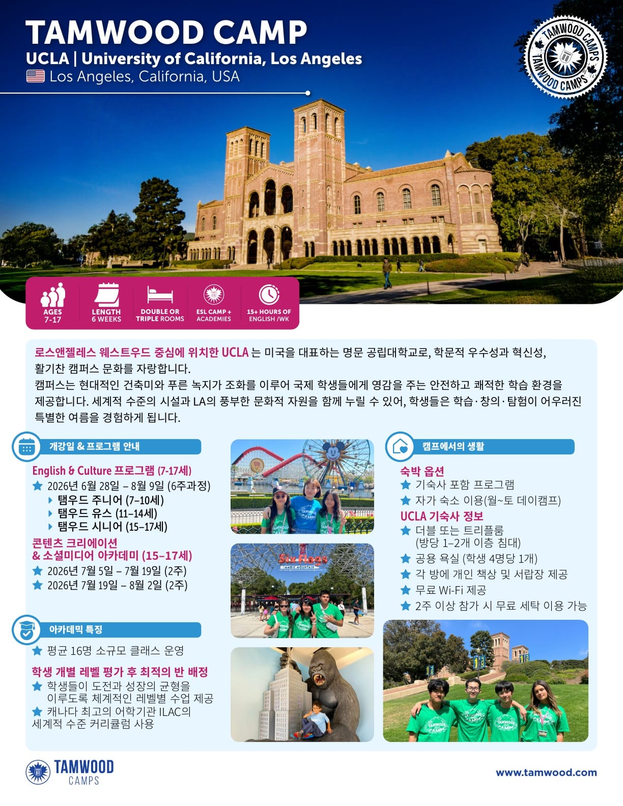 미국영어캠프 2025년 여름 탬우드 브러셔 (UCLA) 2025년 여름 탬우드 브러셔 (UCLA) 입니다. 유학피플 문의 02-554-8666 21 3월 2025 — 2 min read