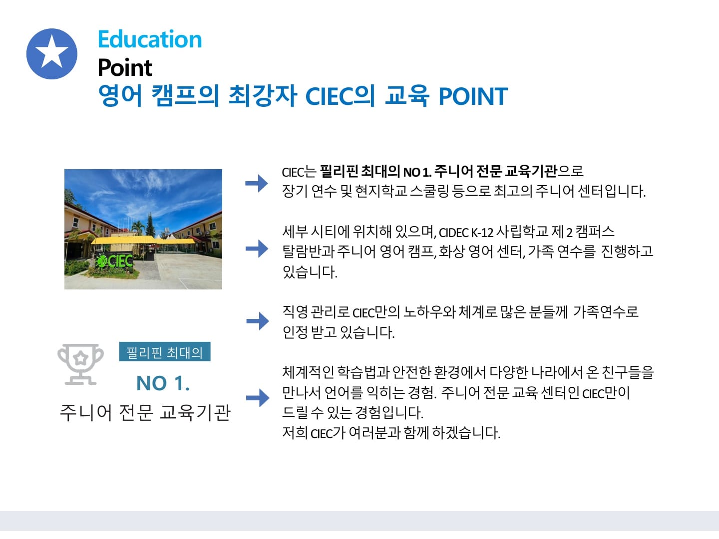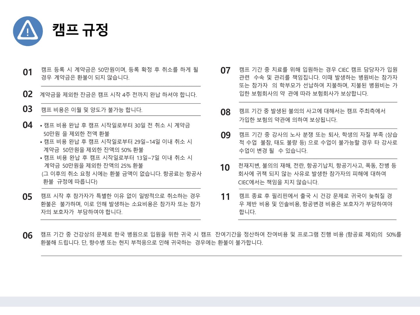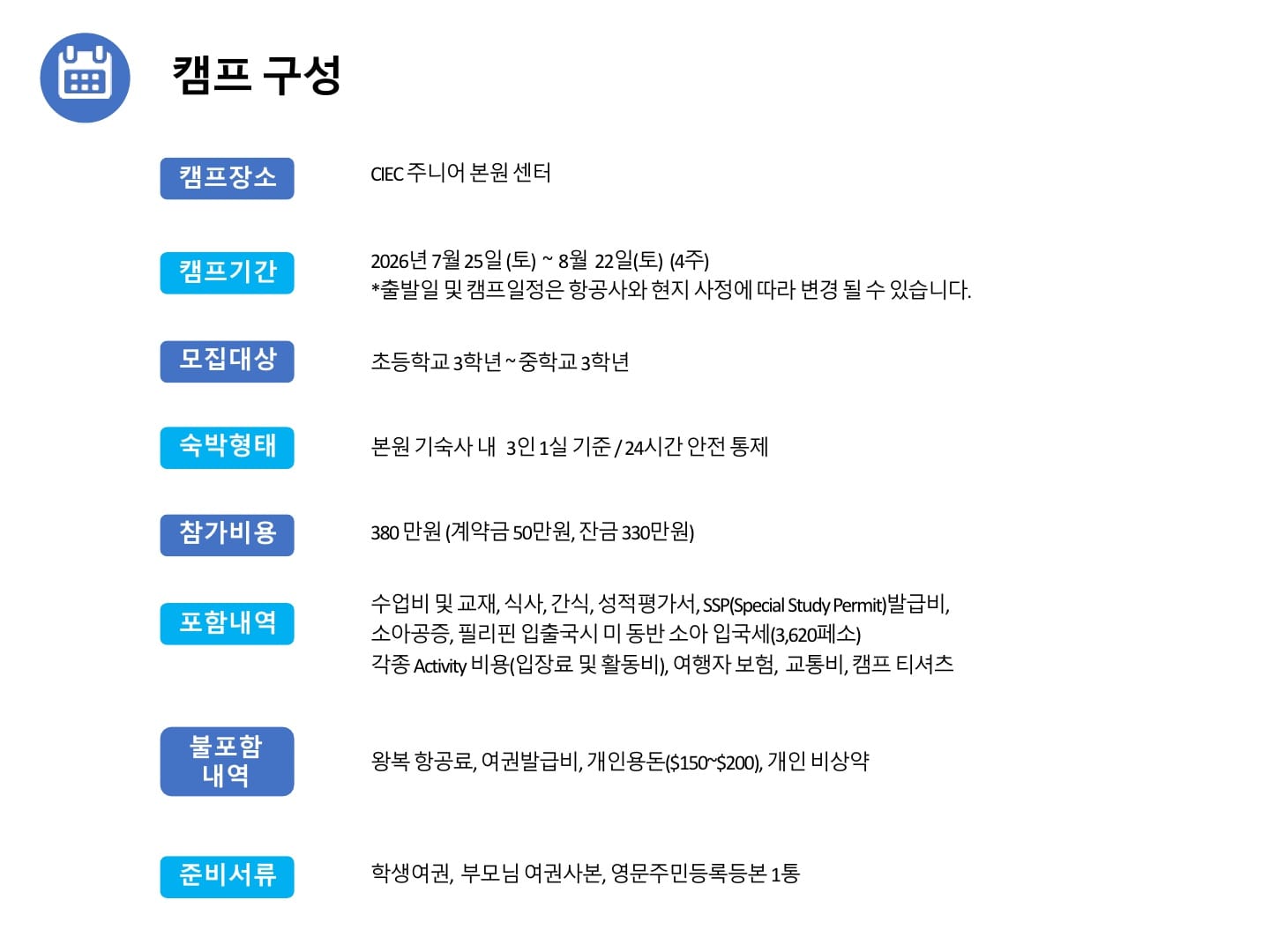 필리핀영어캠프 2026년 여름 CIEC 영어 캠프 브로셔 2026년 여름 CIEC 영어 캠프 브로셔입니다. 유학피플 문의 02-554-8666 13 8월 2024 — 2 min read