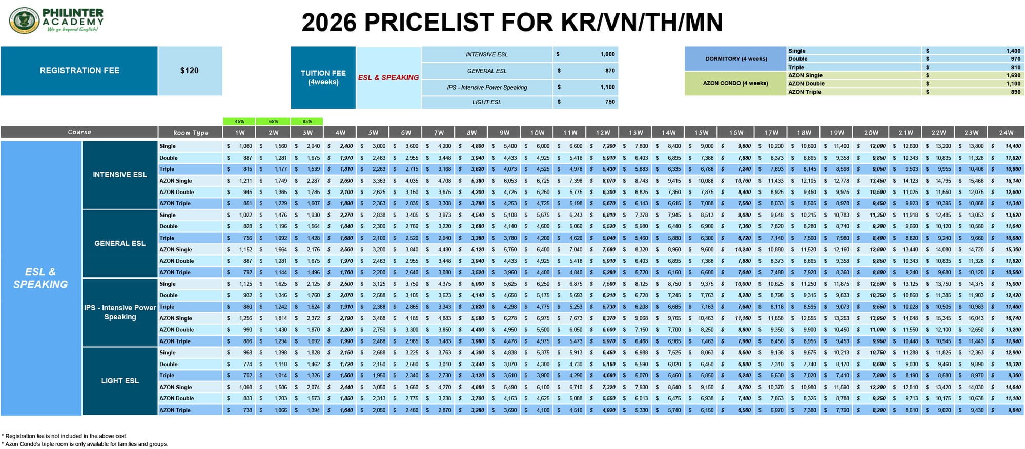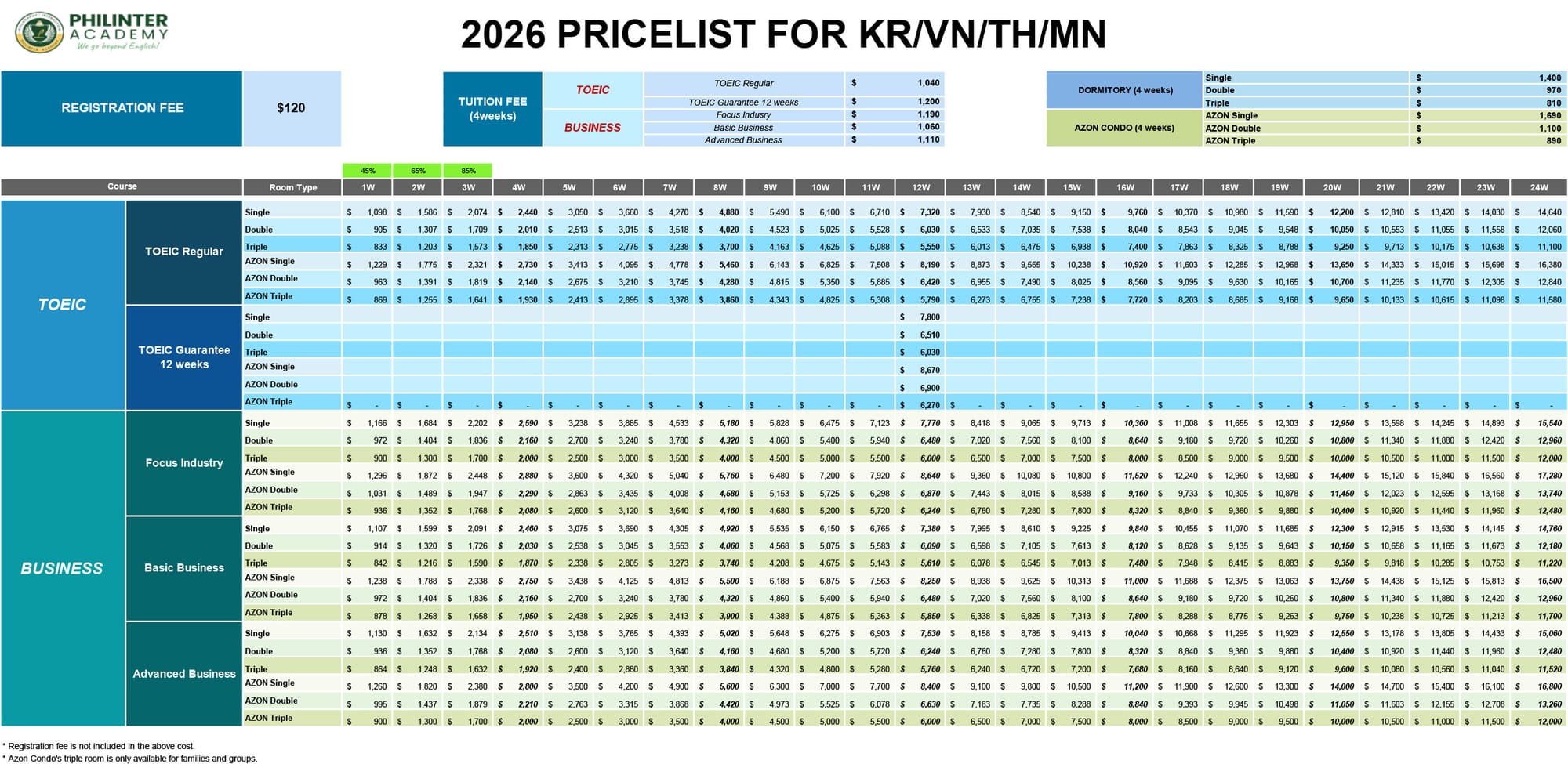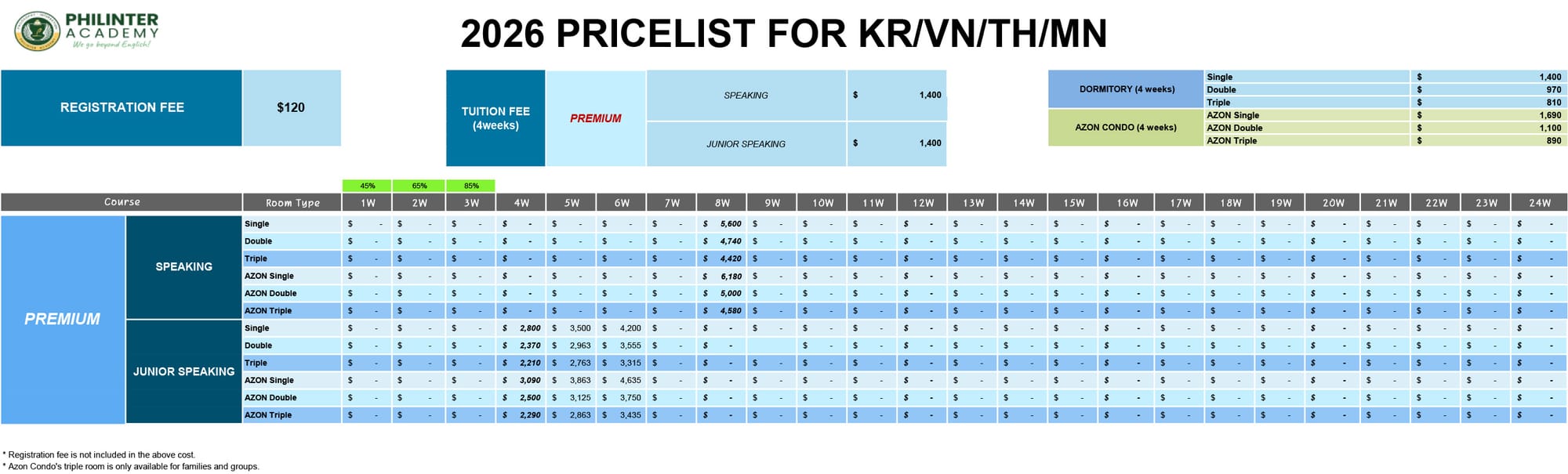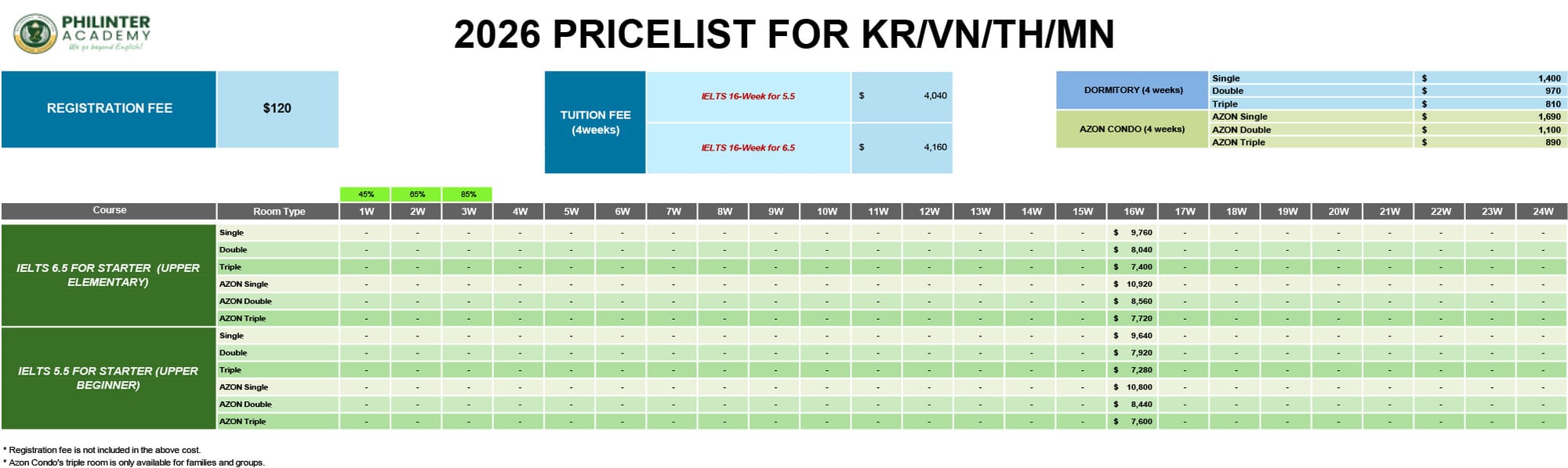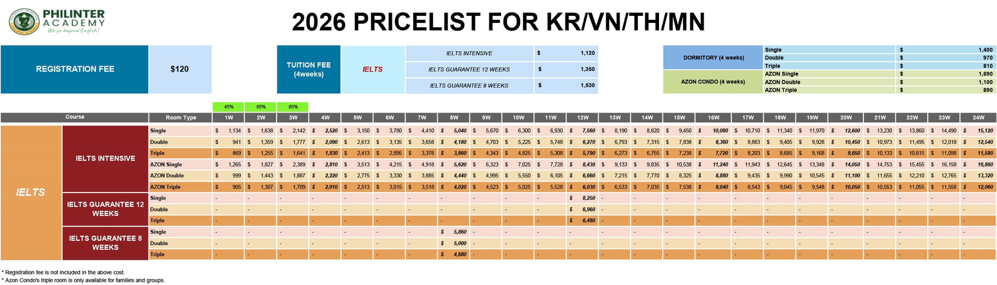 Philinter(필인터)어학원 학비표 Ver. 2026.01.06 유학피플 문의 02-554-8666 10 8월 2024 — 1 min read ESL & SpeakingIELTS 아이엘츠TOEIC 토익 /Business 비즈니스프리미엄스페셜 프로그램