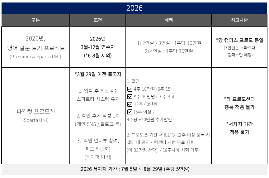 CELLA(셀라)어학원 프로모션 ver.2025.11.26 UHAKPEOPLE 1644-2570 26 11월 2025 — 1 min read 2026년도 얼리버드 프로모션 2025년 스파르타 유니 프로모션10월 5일 ~ 2026년 3월 29 (출국일 기준) 2025년도 비수기 프로모션 안내