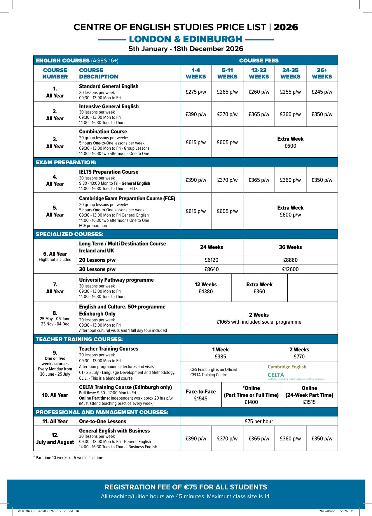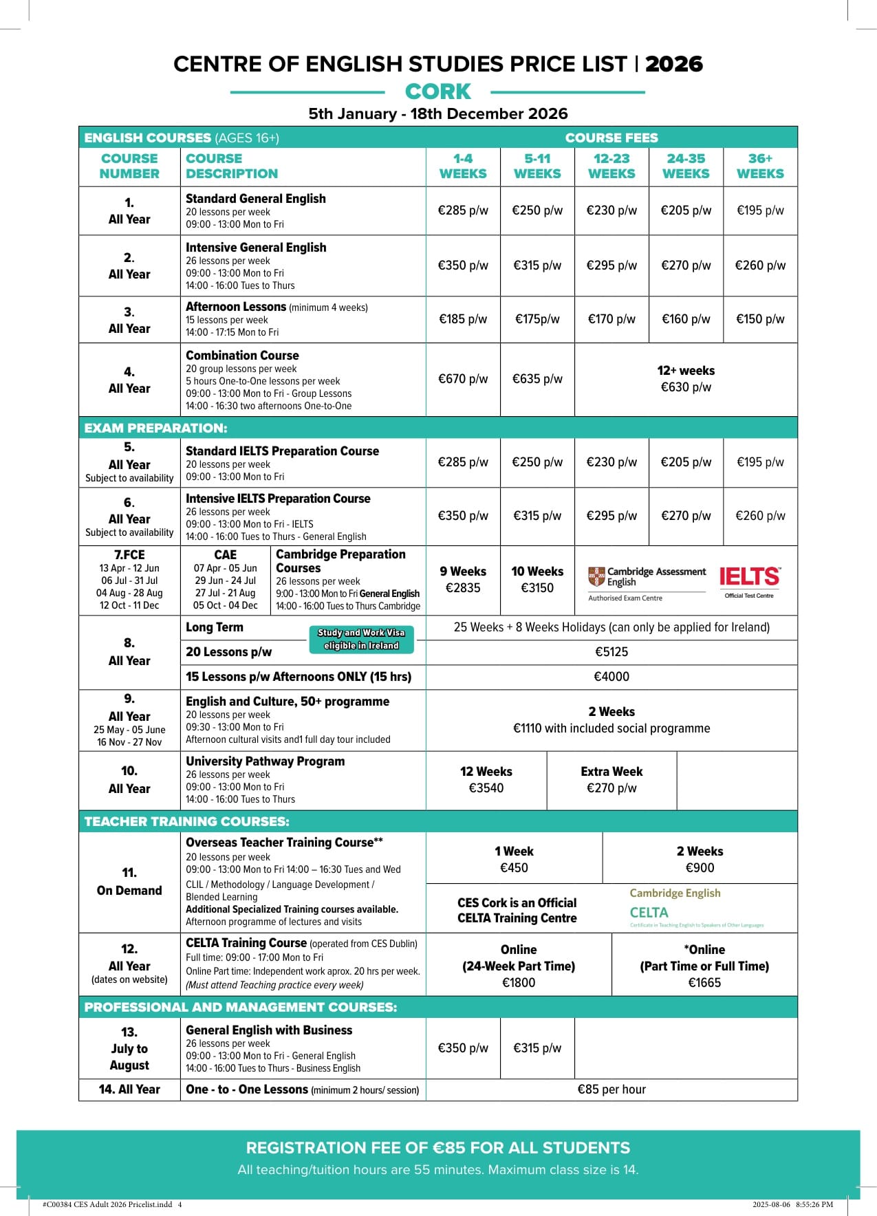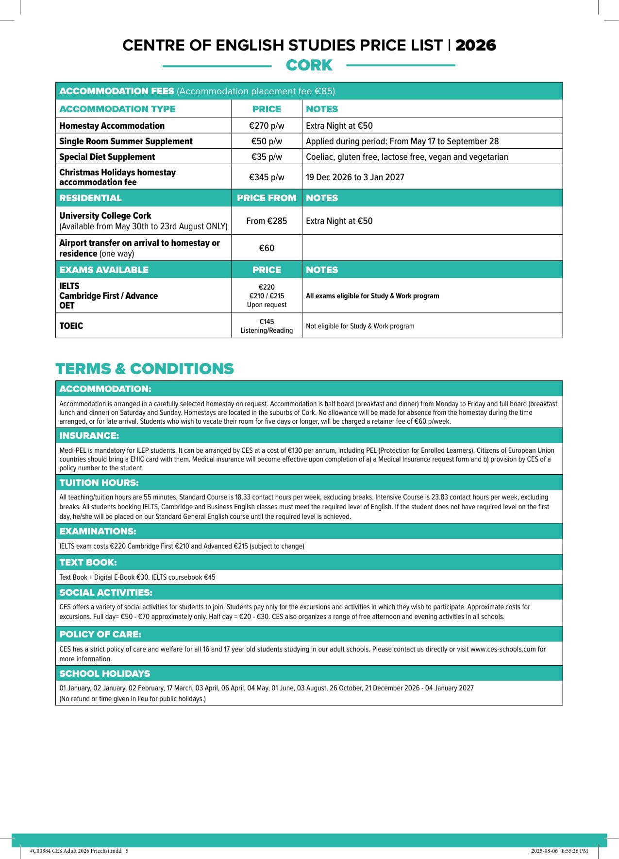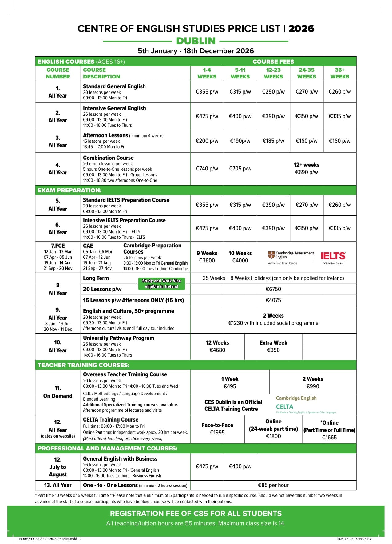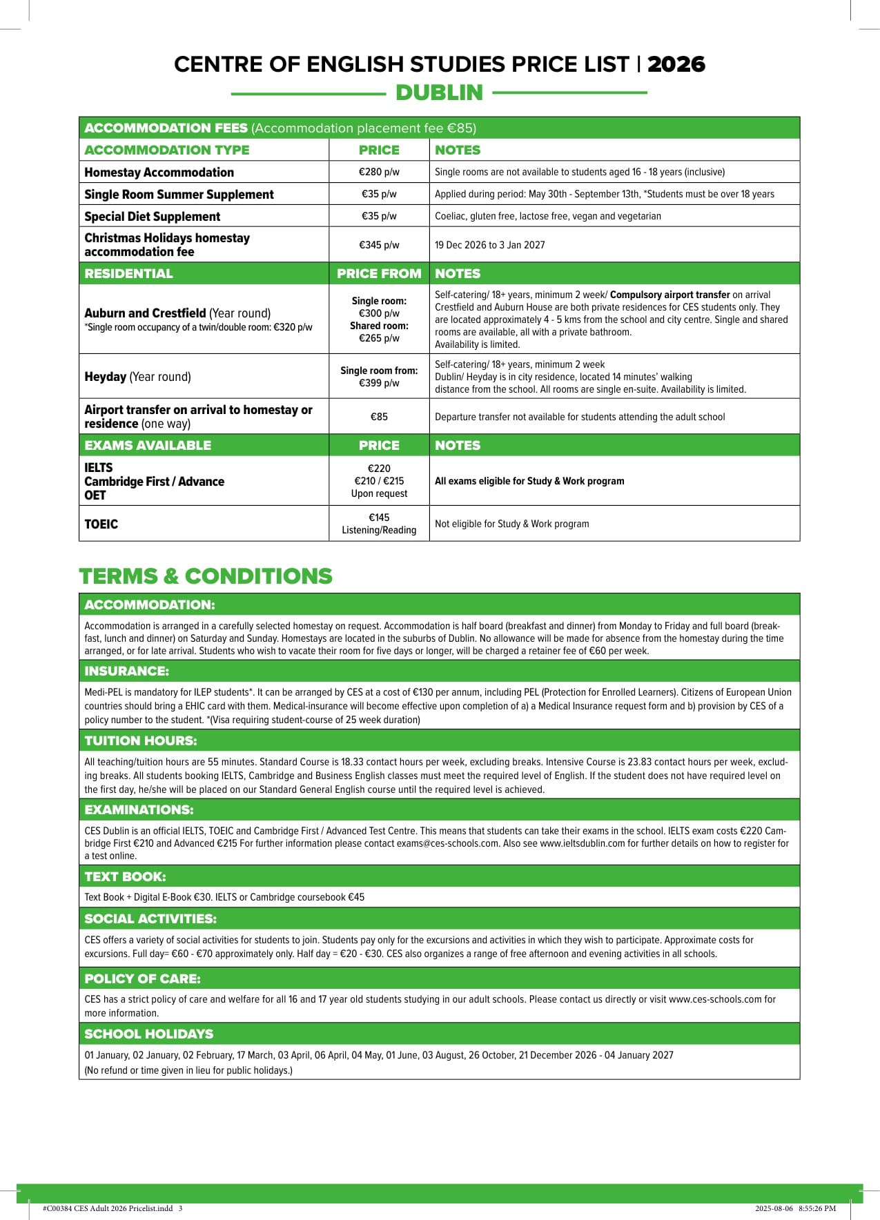 ✅ 예) 영국 8주 + 아일랜드 12주 등록 → 영국 1주 + 아일랜드 2주 무료 홈스테이 제공