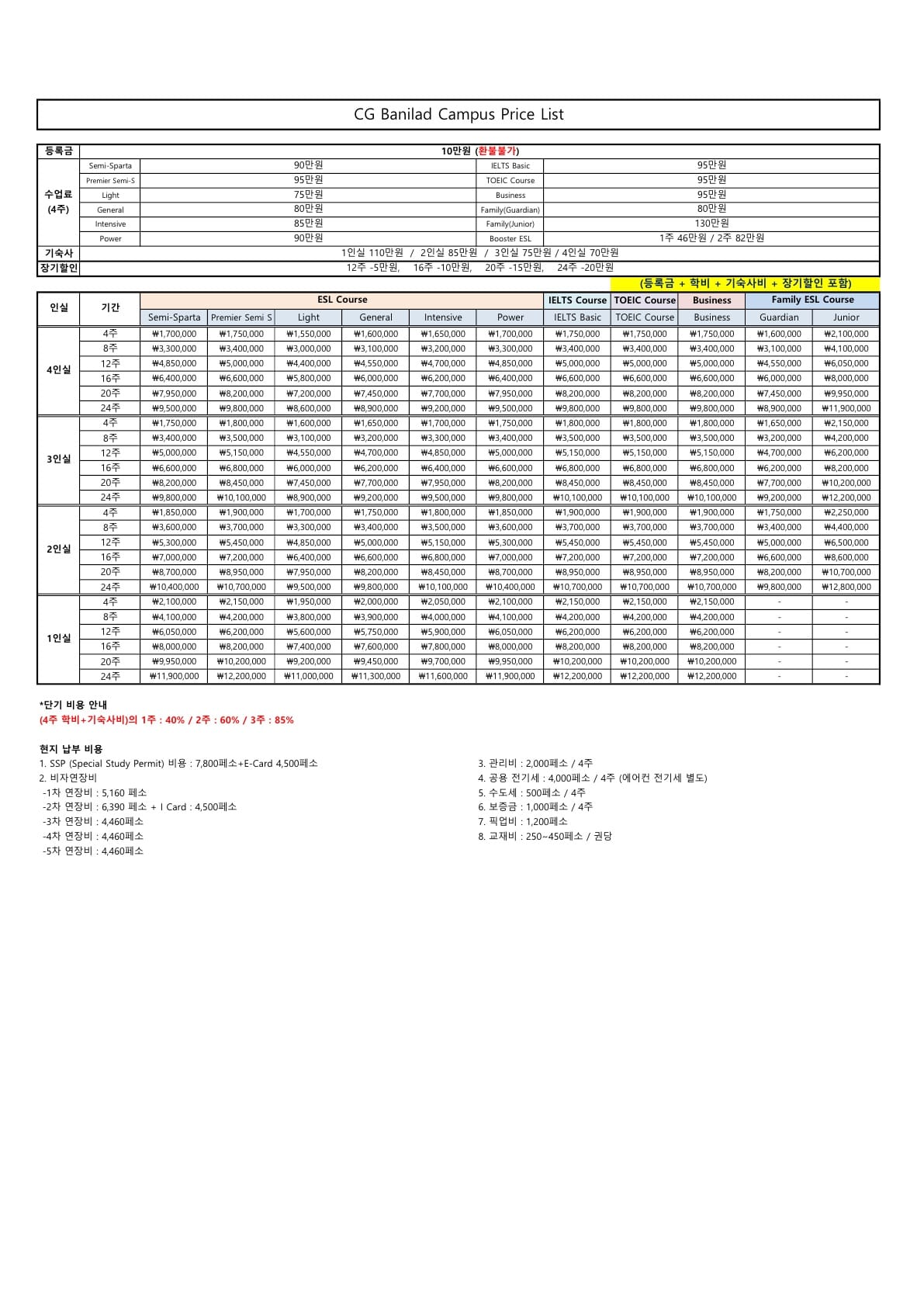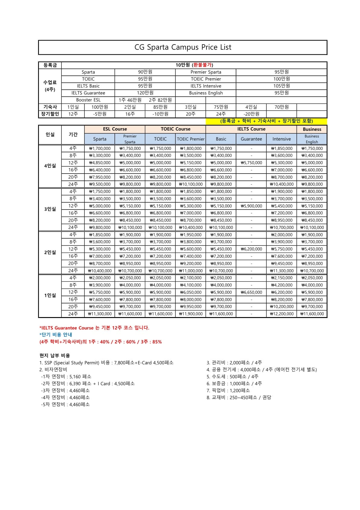 필리핀어학연수 CG어학원 학비표 ver. 2025.10.24 유학피플 문의 02-554-8666 21 8월 2024 • 1 min read 스파르타 캠퍼스 학비바닐라드 캠퍼스 학비25년 하반기 프로모션2025년도 현지 비용 인상