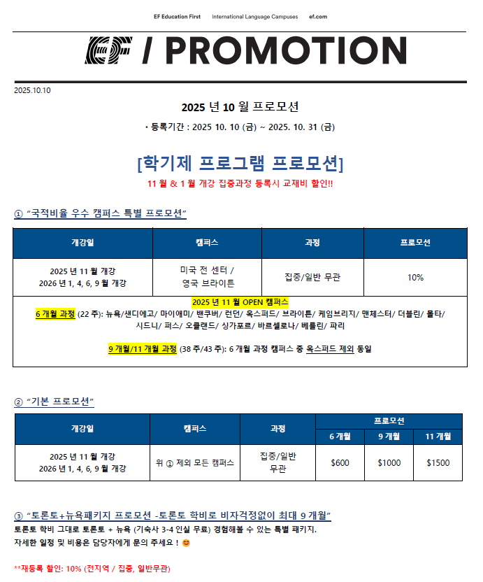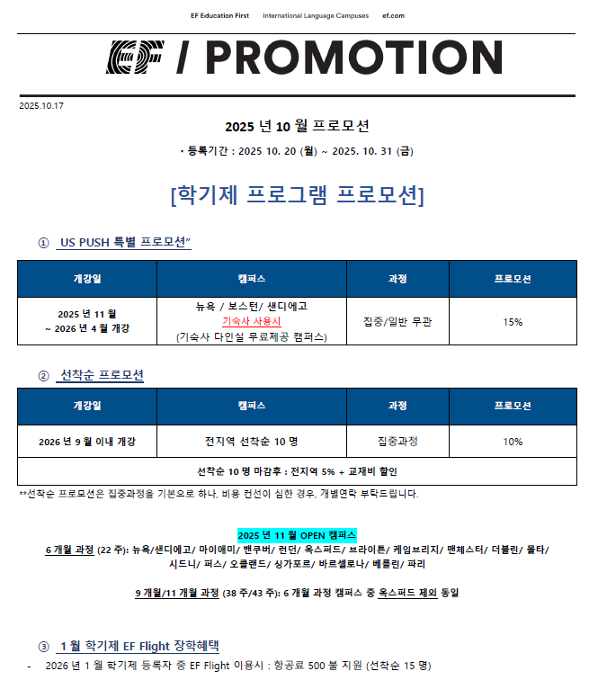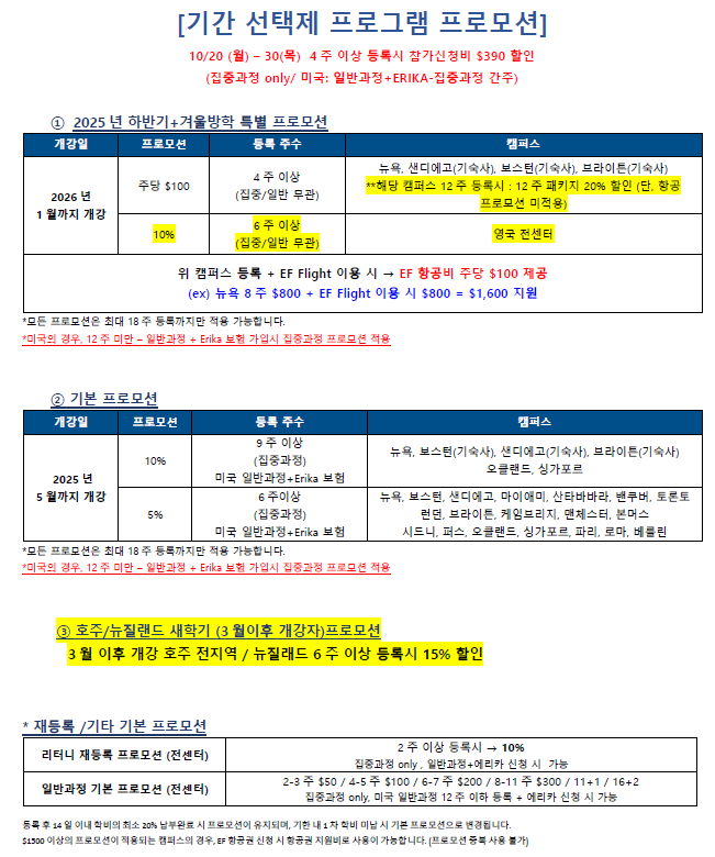 어학연수 EF 어학원 학비표 안내 ver.2025.10.16 유학피플 문의 02-554-8666 26 8월 2024 • 2 min read 2025/10/20~10/31 플래시 프로모션2025년 10월 프로모션