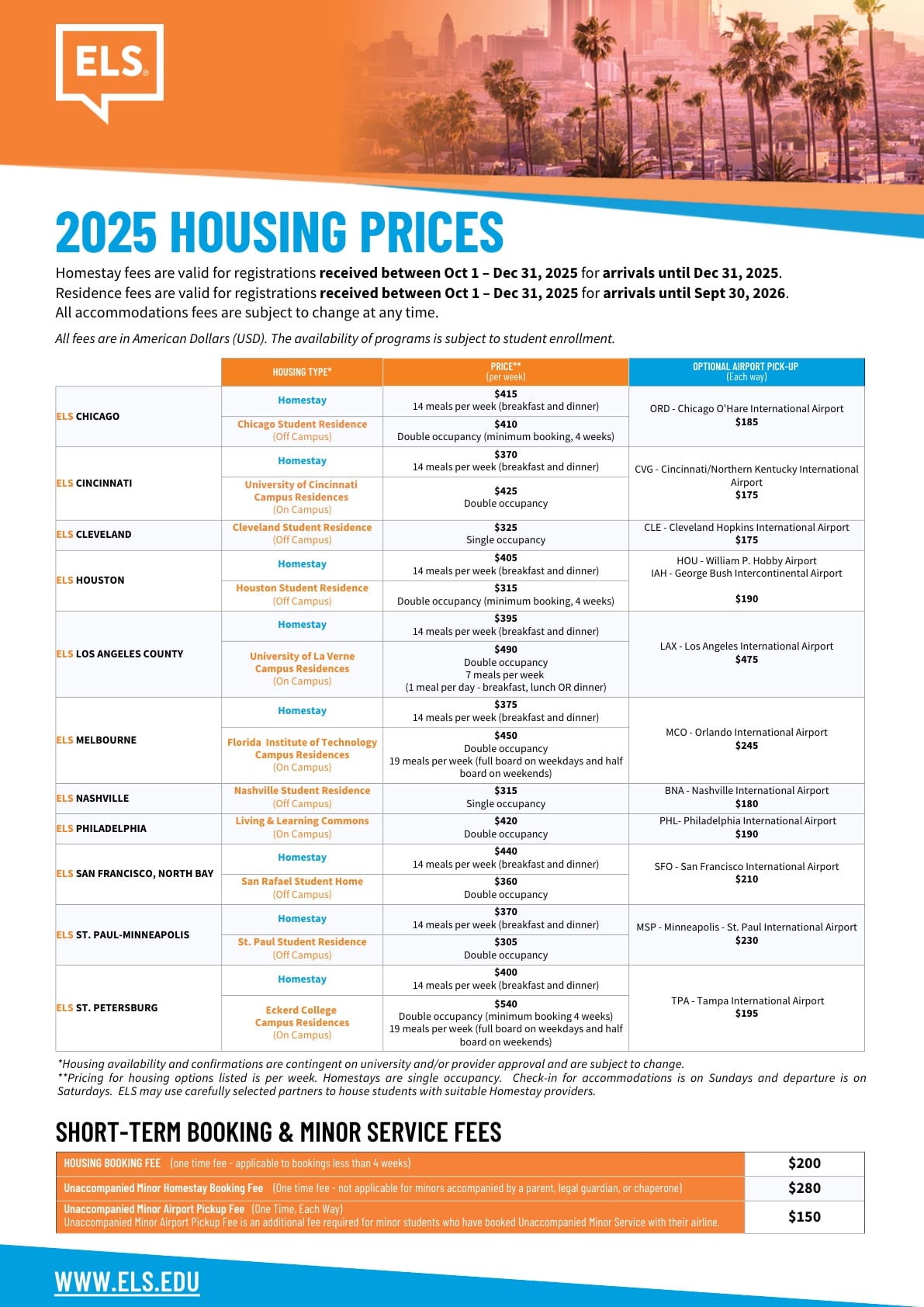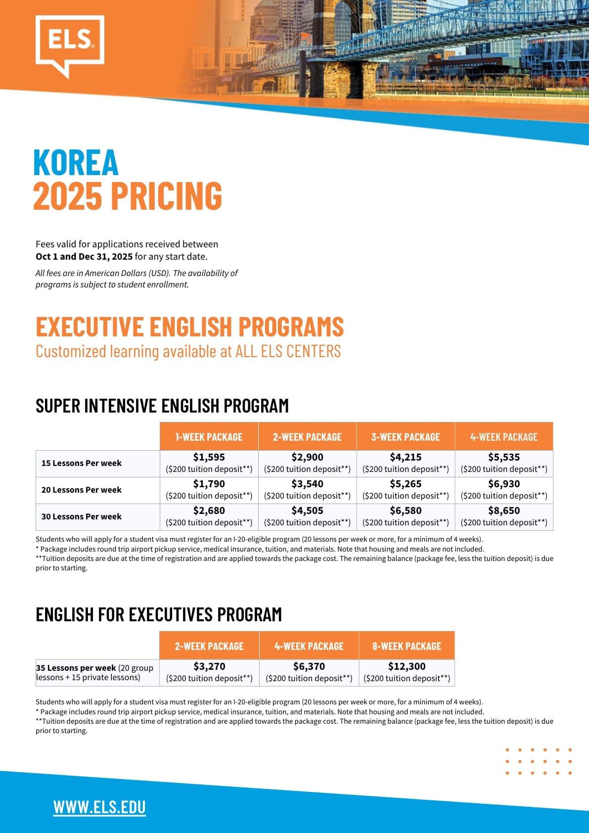 어학연수 ELS 어학원 미국 학비표 Ver.2025.09.29 유학피플 문의 02-554-8666 05 9월 2024 • 1 min read 기숙사 비용 (2025년 10월 ~12월)기숙사 및 홈스테이 약관 2025년 10월~12월 프로모션