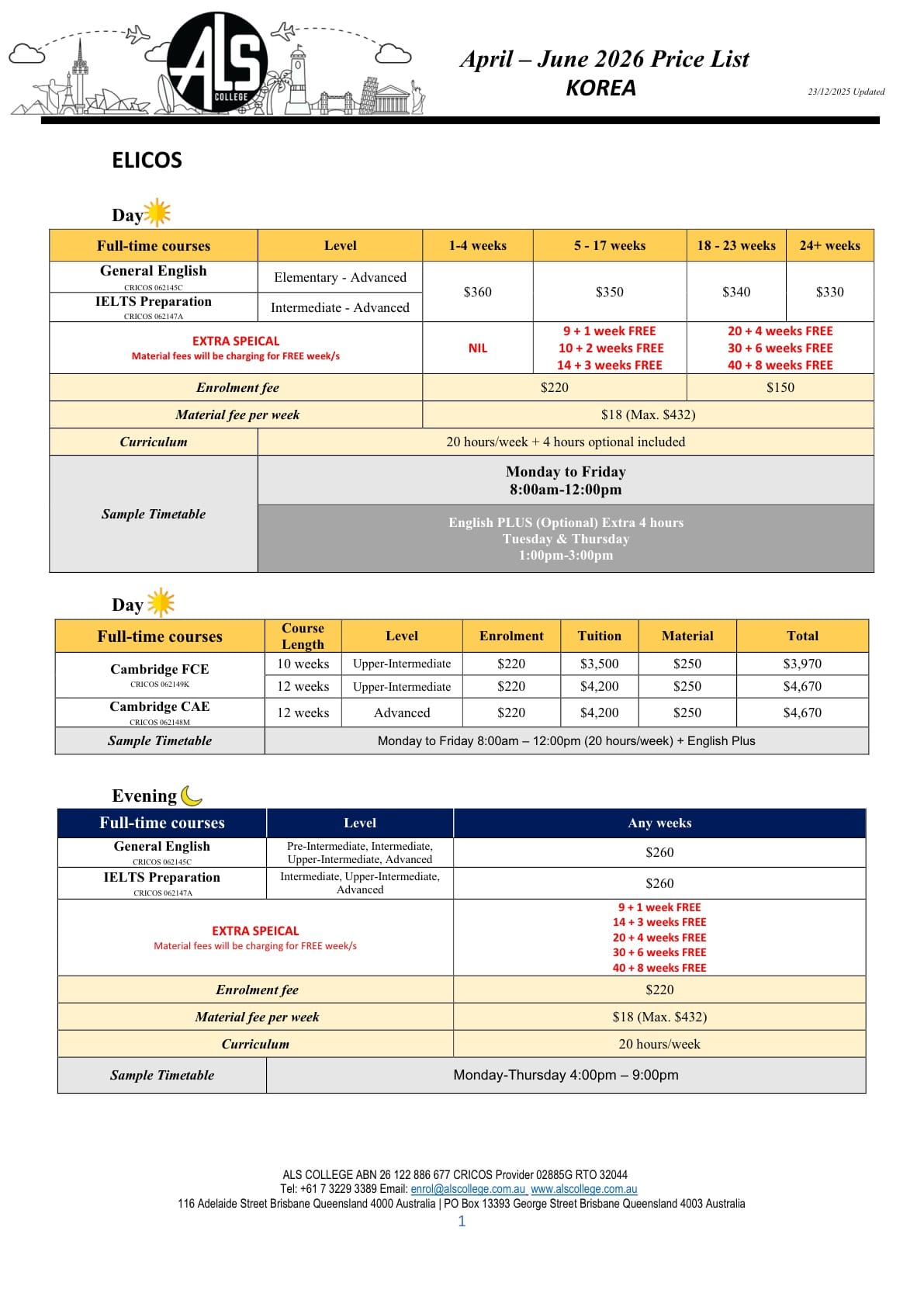 호주어학연수 IH Brisbane 학비표 Ver.2025.09.30 유학피플 문의 02-554-8666 26 3월 2025 — 1 min read 2025년 10~12월 Offshore 학생 학비 안내 - VET 과정2025년 10~12월 Onshore 학생 학비 안내 - VET 과정