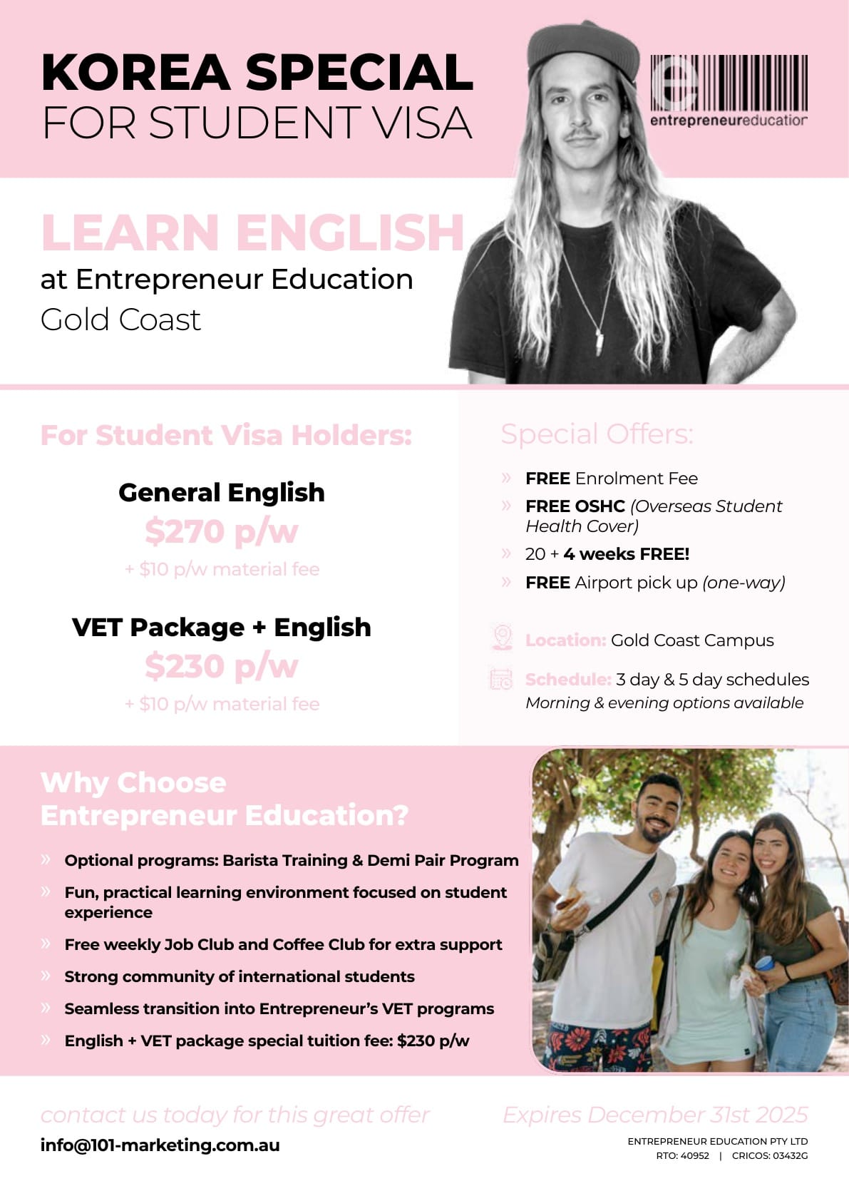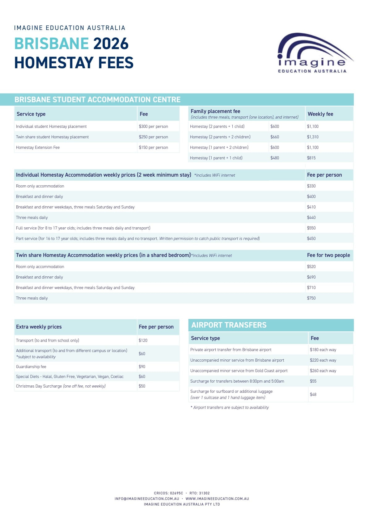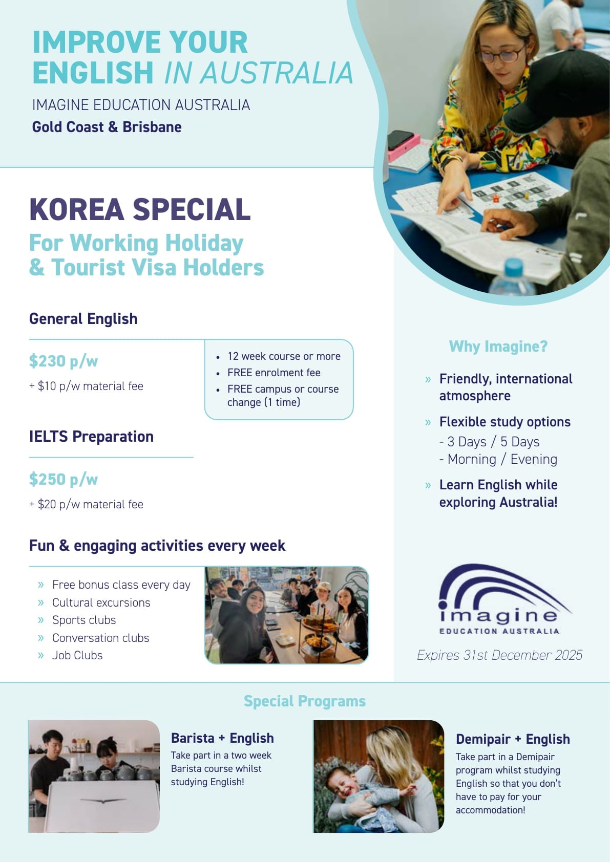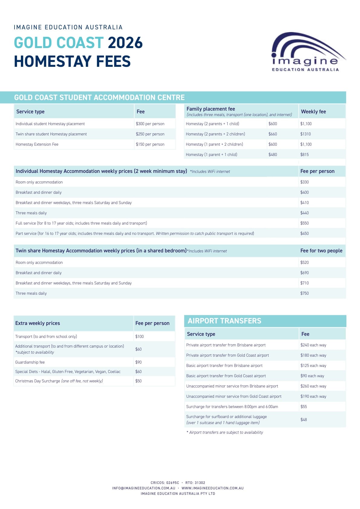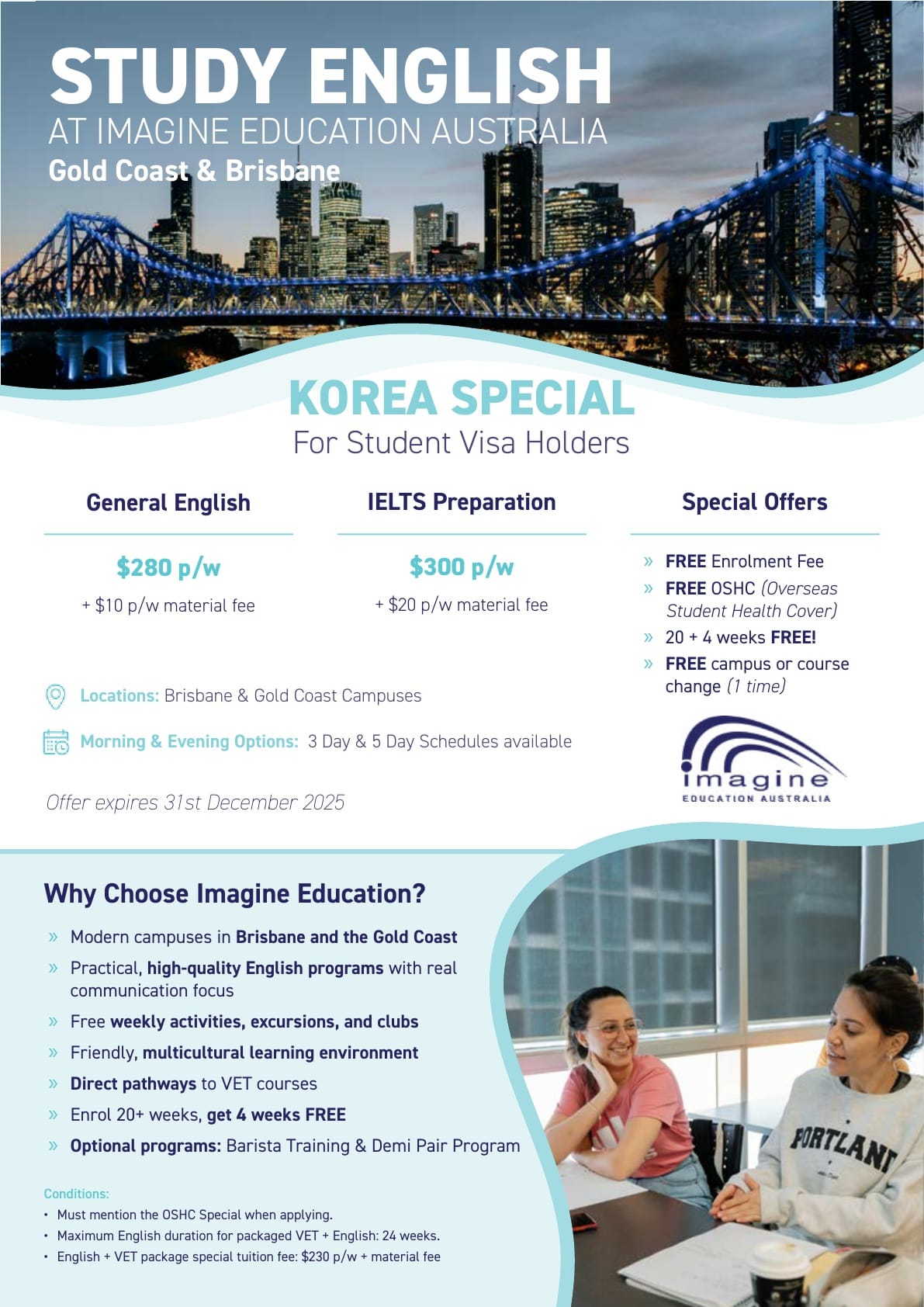 호주어학연수 Imagine Education Australia 학비표 ver.2025.10.14 유학피플 문의 02-554-8666 27 3월 2025 • 1 min read 2026년도 Homestay Fees Imagine 프로모션(~12월 31일까지)EE 프로모션 (2025년 12월 31일까지)