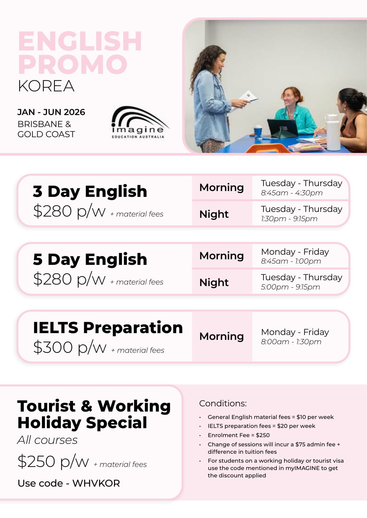 - 시작일은 2026년 12월 31일 전 언제든지 가능 (Intake: every Monday)바로 시작 가능한 학생 대상, 입학금 면제 스페셜