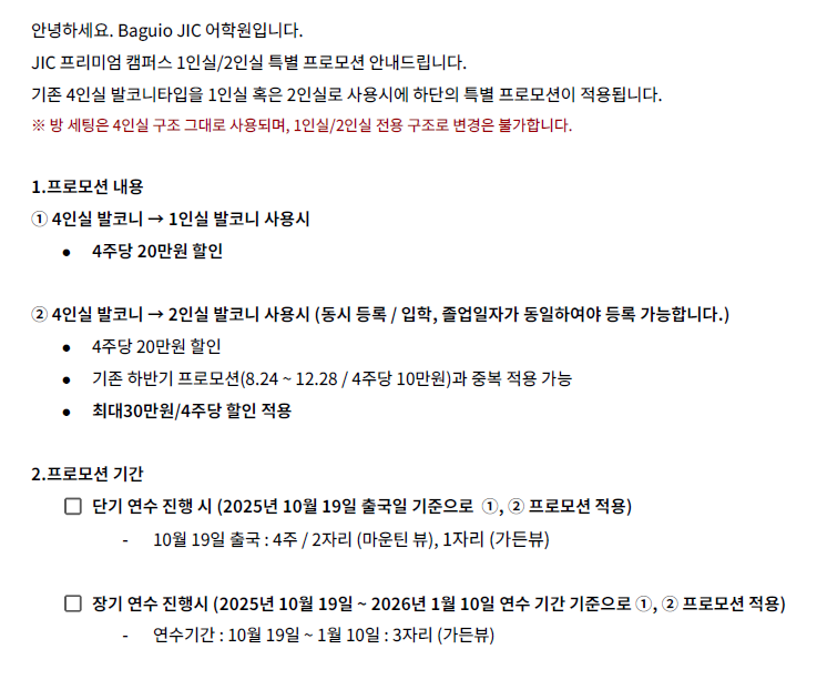 필리핀어학연수 JIC어학원 프리미엄 캠퍼스 학비 ver. 2025.10.13 유학피플 문의 02-554-8666 21 8월 2024 • 1 min read 2025년도 프로모션2026년 프로모션