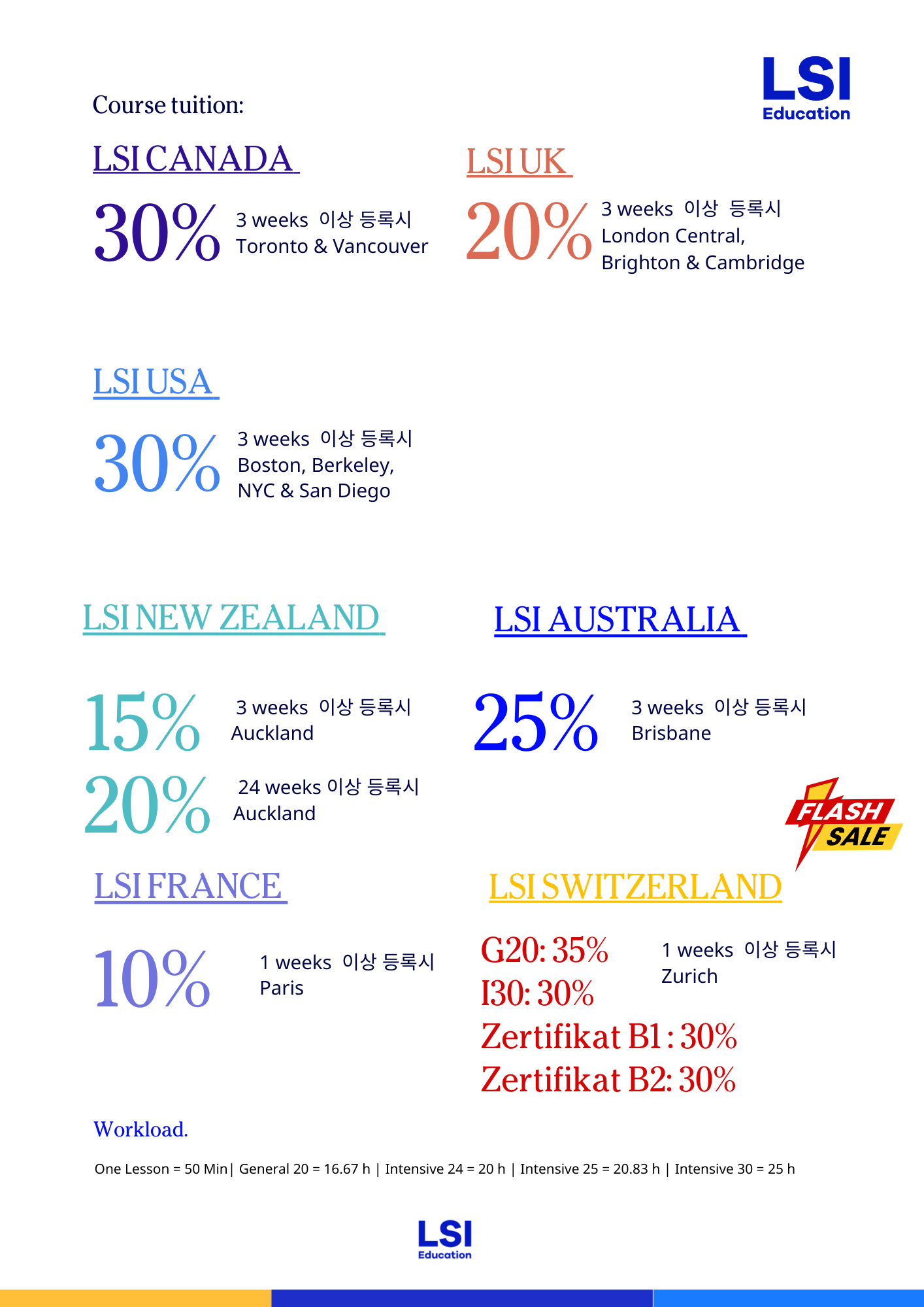 어학연수 LSI 어학원 학비표 Ver. 2025.09.30 유학피플 문의 02-554-8666 28 8월 2024 • 2 min read LSI 프로모션 (2025년 10월 ~12월)