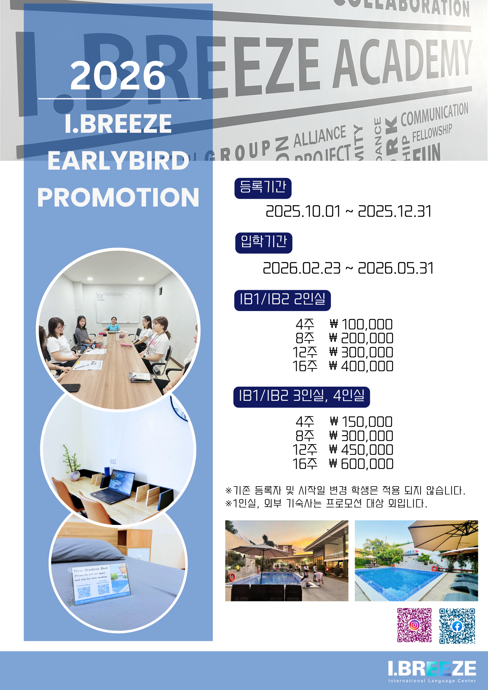 필리핀어학연수 세부 아이브리즈(I.Breeze) 학비표 ver. 2025.110.31 유학피플 문의 02-554-8666 21 8월 2024 • 1 min read 2025년 7월 이후 현지 비용 인상 안내2025년 11월 프로모션2026년도 얼리버드 프로모션 2025년도 기간별 학비 상세 안내