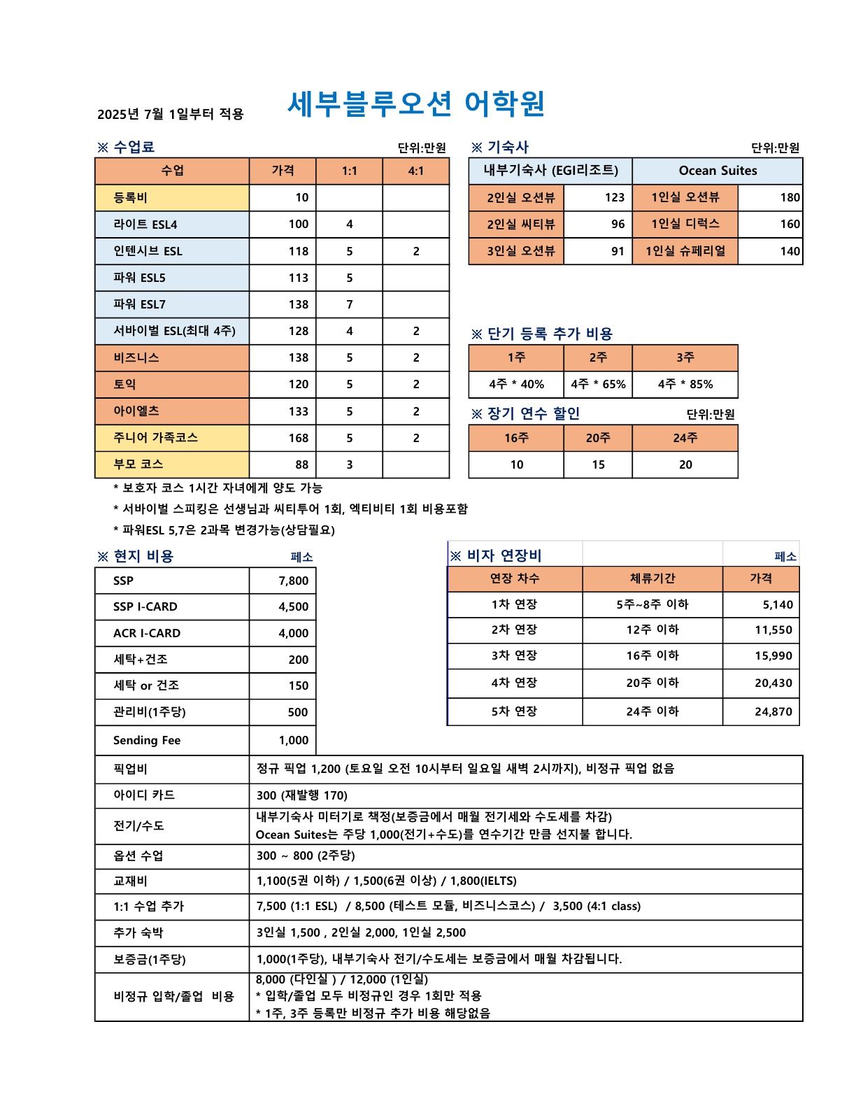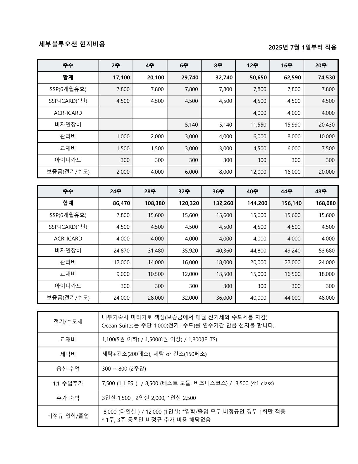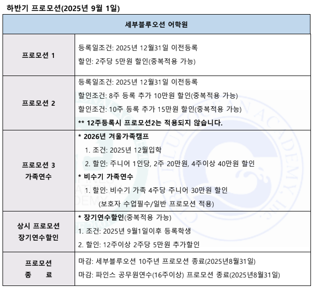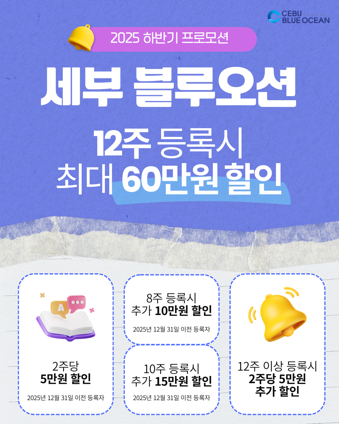 필리핀어학연수 세부 블루오션(Blue Ocean) 학비 ver. 2025.09.01 유학피플 문의 02-554-8666 21 8월 2024 • 1 min read 2025년 하반기(12/31까지) 세부 블루오션 프로모션