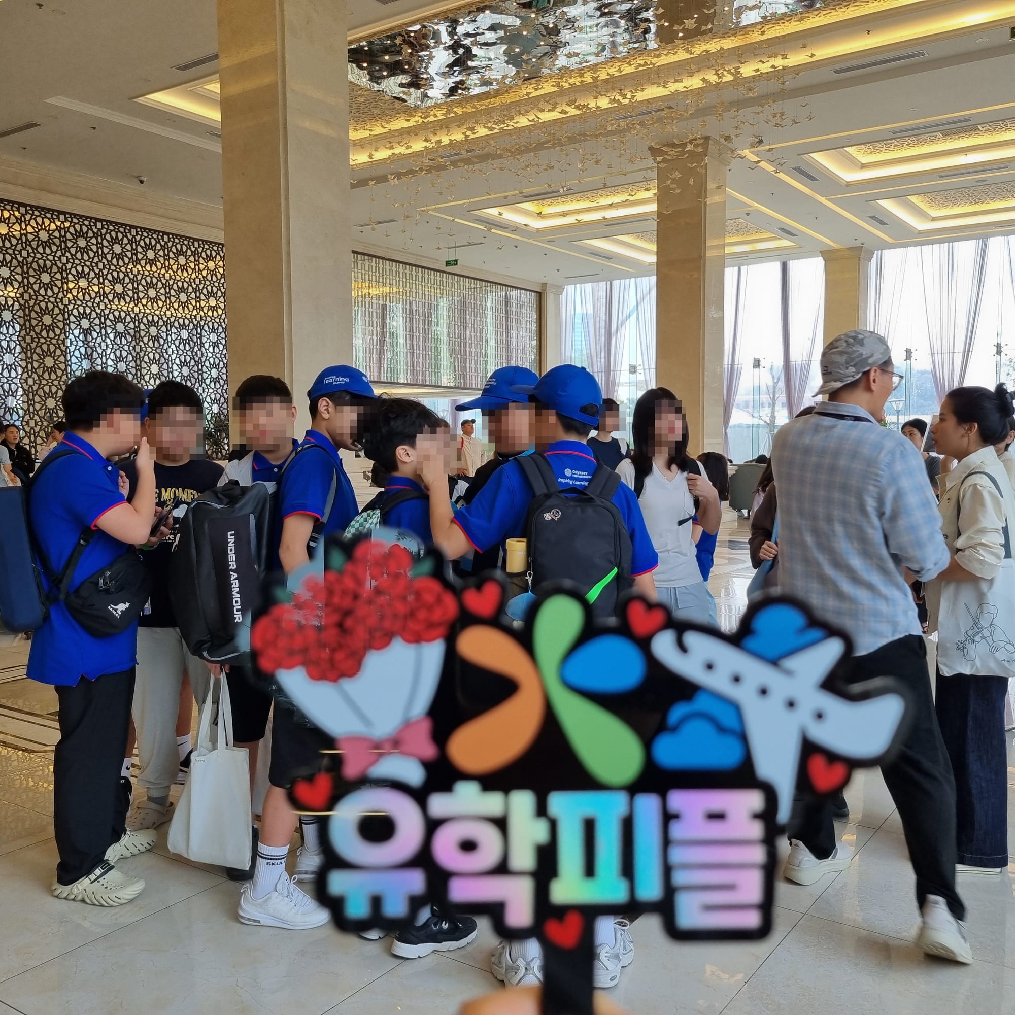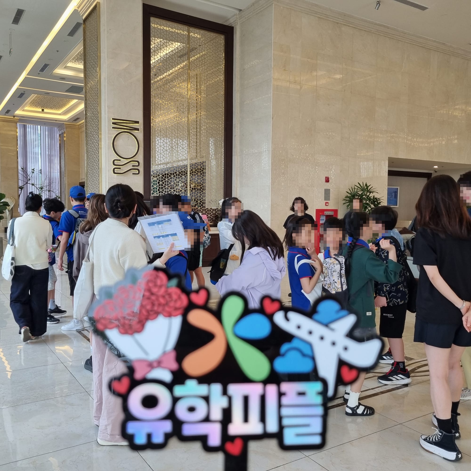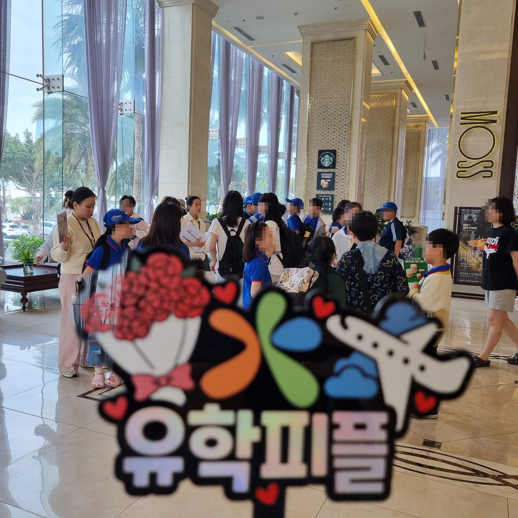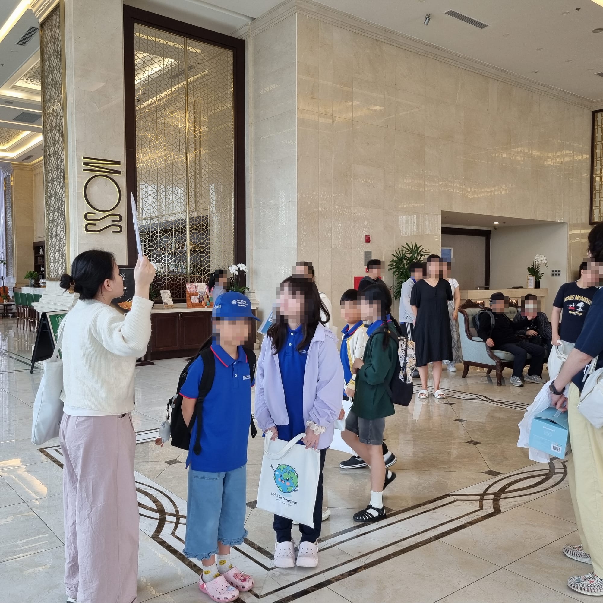출발 전 호텔 1층 로비에 모여 반별로 정렬한 후, 줄을 맞춰 밴에 질서 있게 탑승합니다.