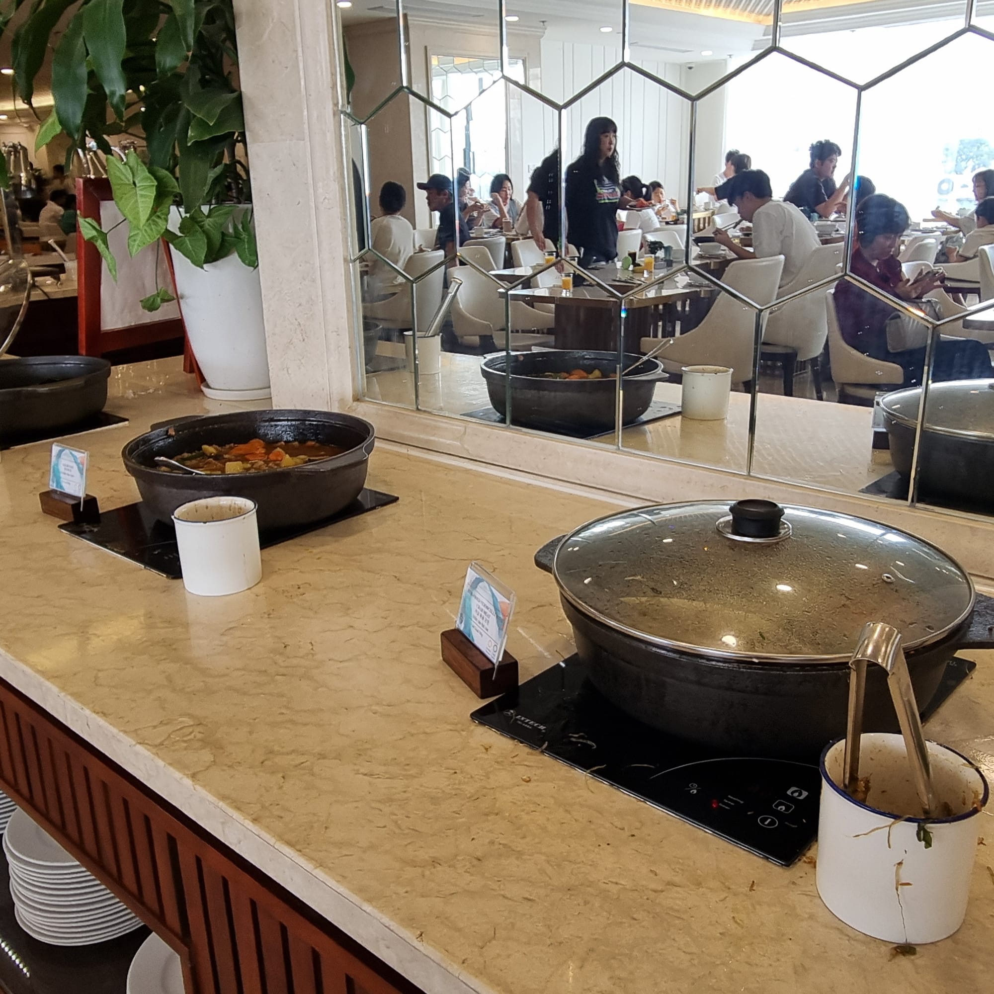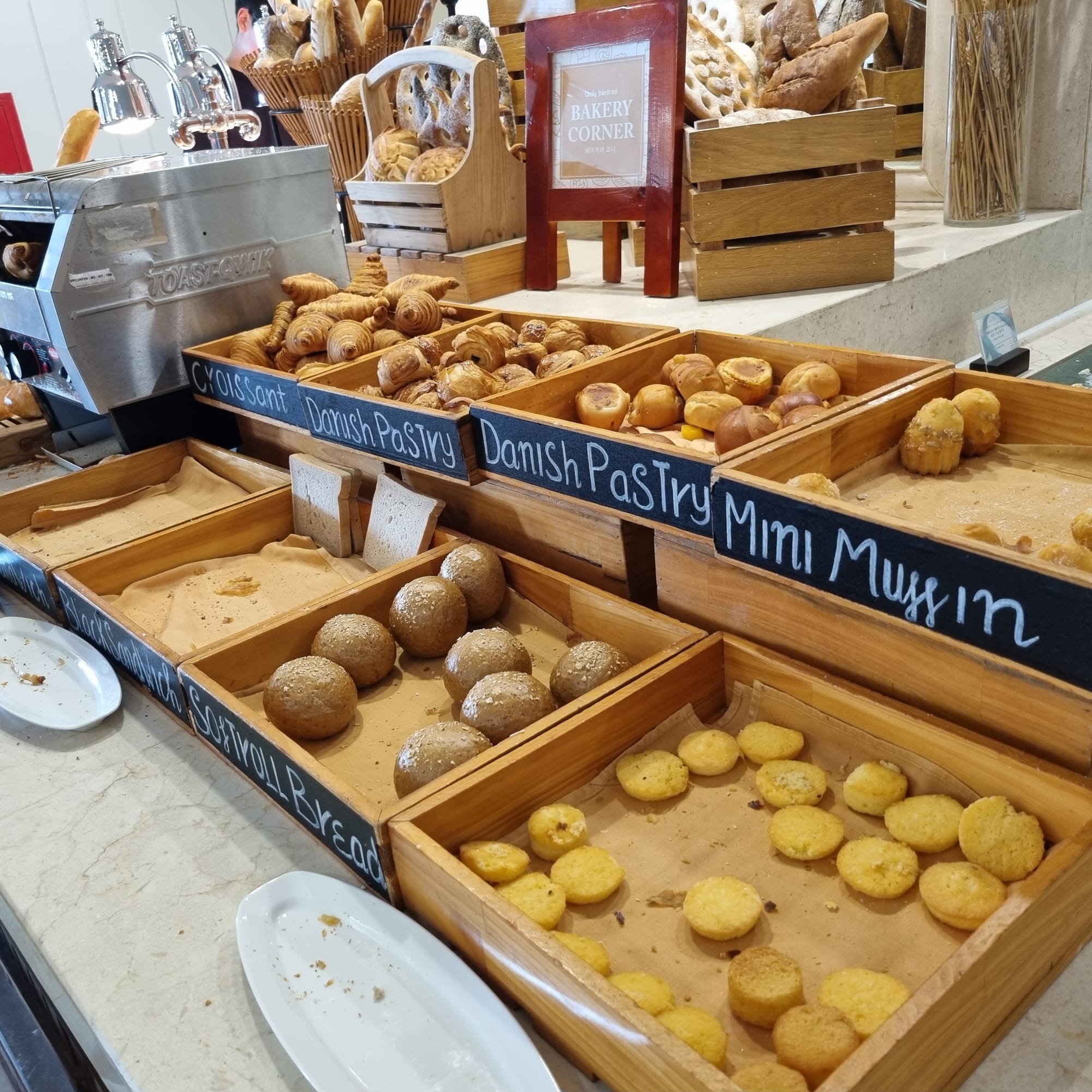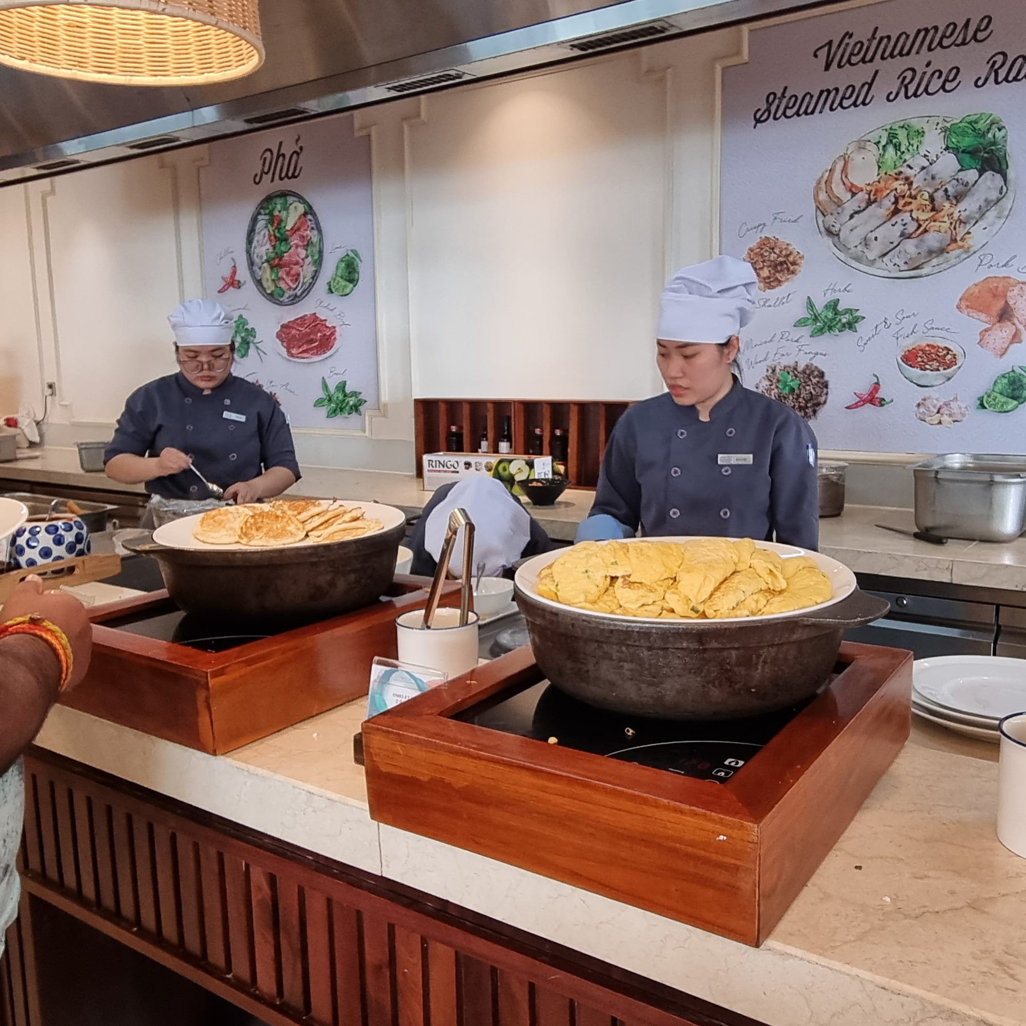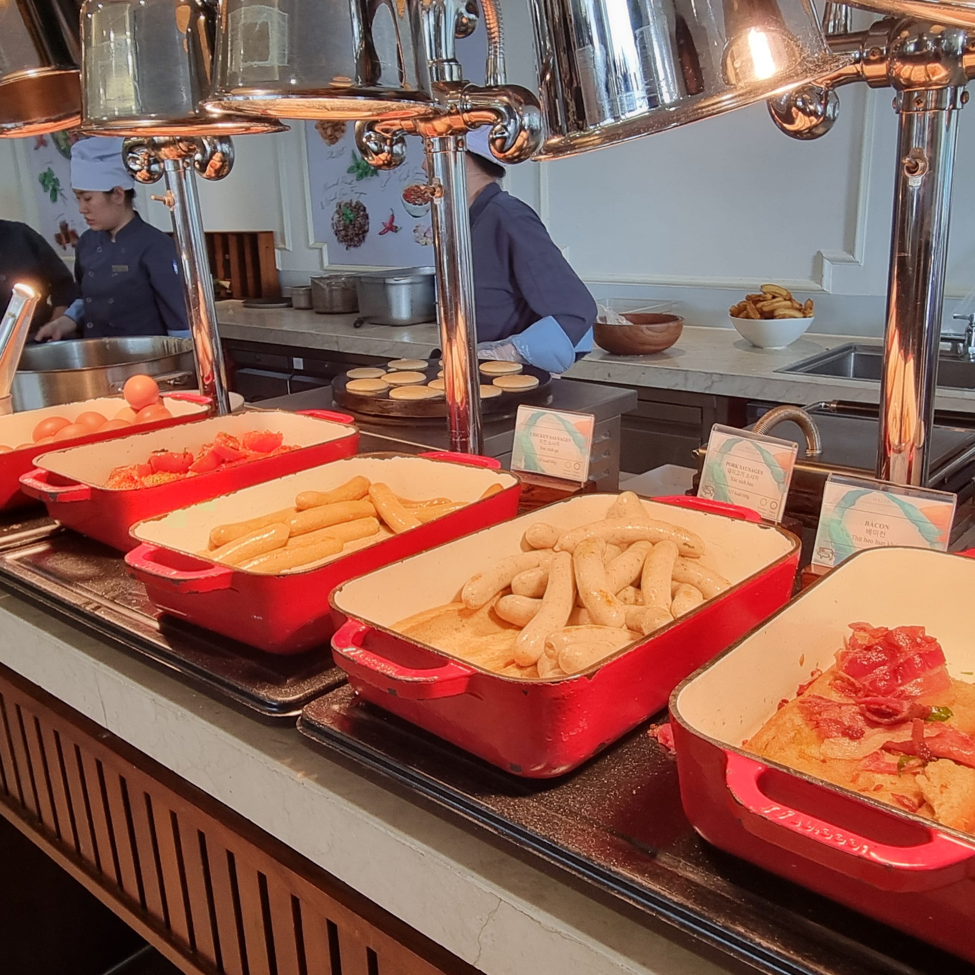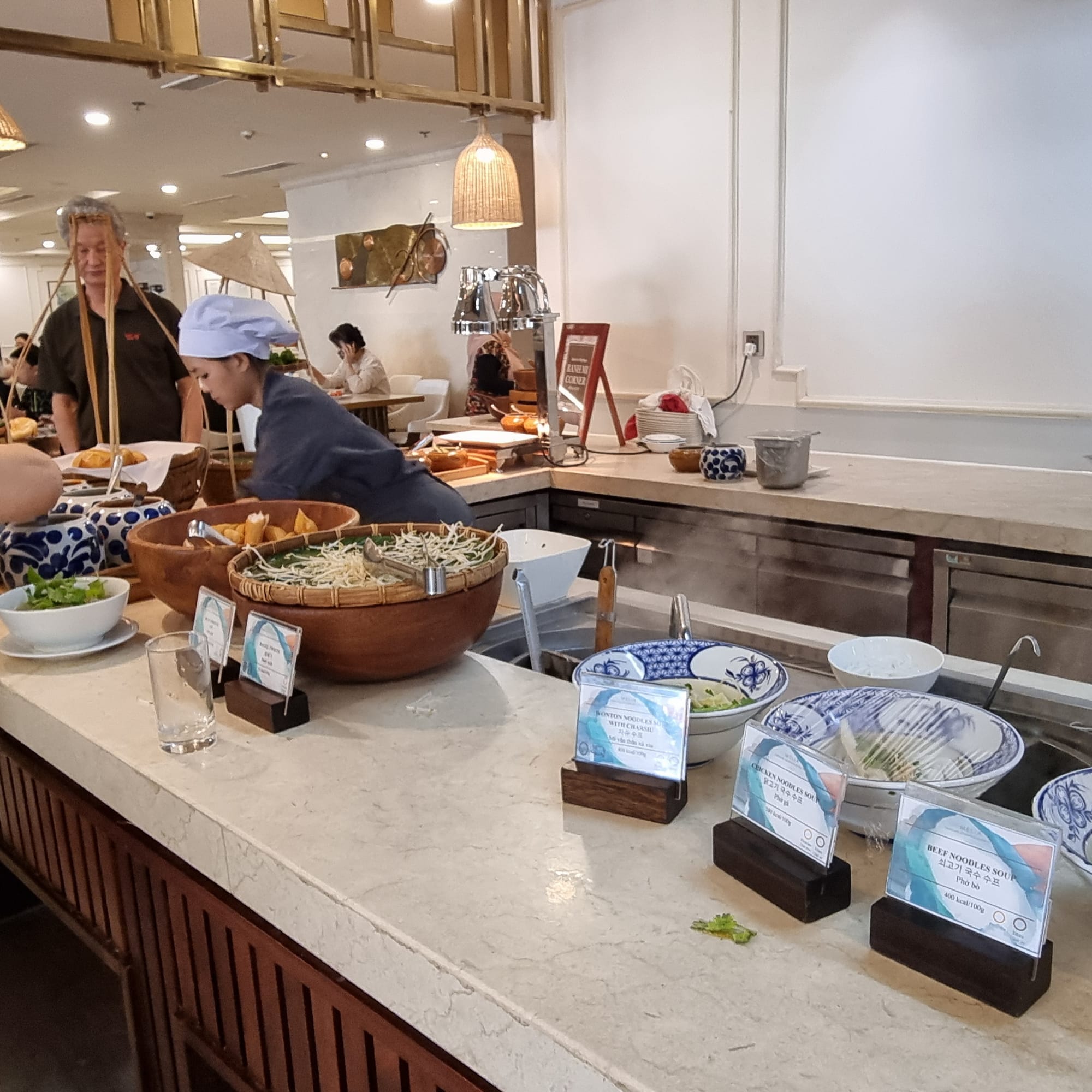우리나라 비빔밥, 찐 고구마를 비롯해 쌀국수, 신선한 과일, 소시지, 빵 등이 준비되어 있어 아이부터 어른까지 입맛에 맞게 선택하여 드실 수 있습니다.