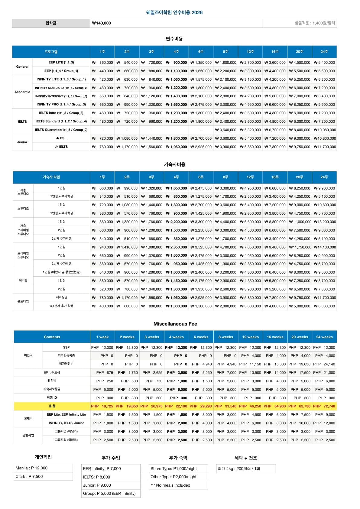 WALES(웨일즈) 어학원 학비표